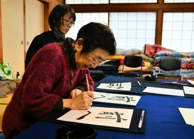新年の抱負を毛筆で書く「書き初め」が3日、石川県珠洲市大谷町の公民館であった。地域の人たちが書家の阿部豊寿さん(47)=金沢市=に教わりながら「感謝」「一歩一歩」「整理整頓」などとしたためた。
